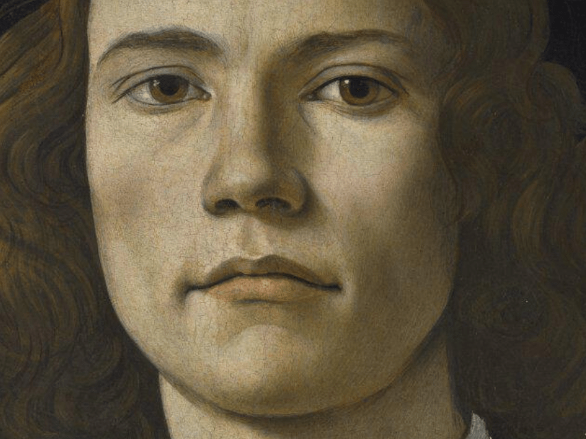 «Querido Pan y todos los demás dioses que aquí habitan: concédanme ser bello por dentro, y por fuera, que todo lo que tenga esté en armonía con lo de adentro. Que considere rico al sabio, y que todo el dinero que yo tenga no sea más que el que puede poseer un hombre sensato.» Esta oración dicha por Sócrates al final del Fedro―diálogo donde se explora y discute la belleza y el amor, entre otros temas―es la leyenda perfecta para este hermoso retrato pintado por el gran Sandro Botticelli. Hasta esta fecha los artistas renacentistas italianos solían pintar a sus retratados de perfil o mirando ligeramente hacia al frente. Pero con la llegada a Florencia de muchos retratos pintados en el estilo flamenco, con el retratado mirando hacia al frente, los artistas italianos empezaron a pintar de esta manera.
