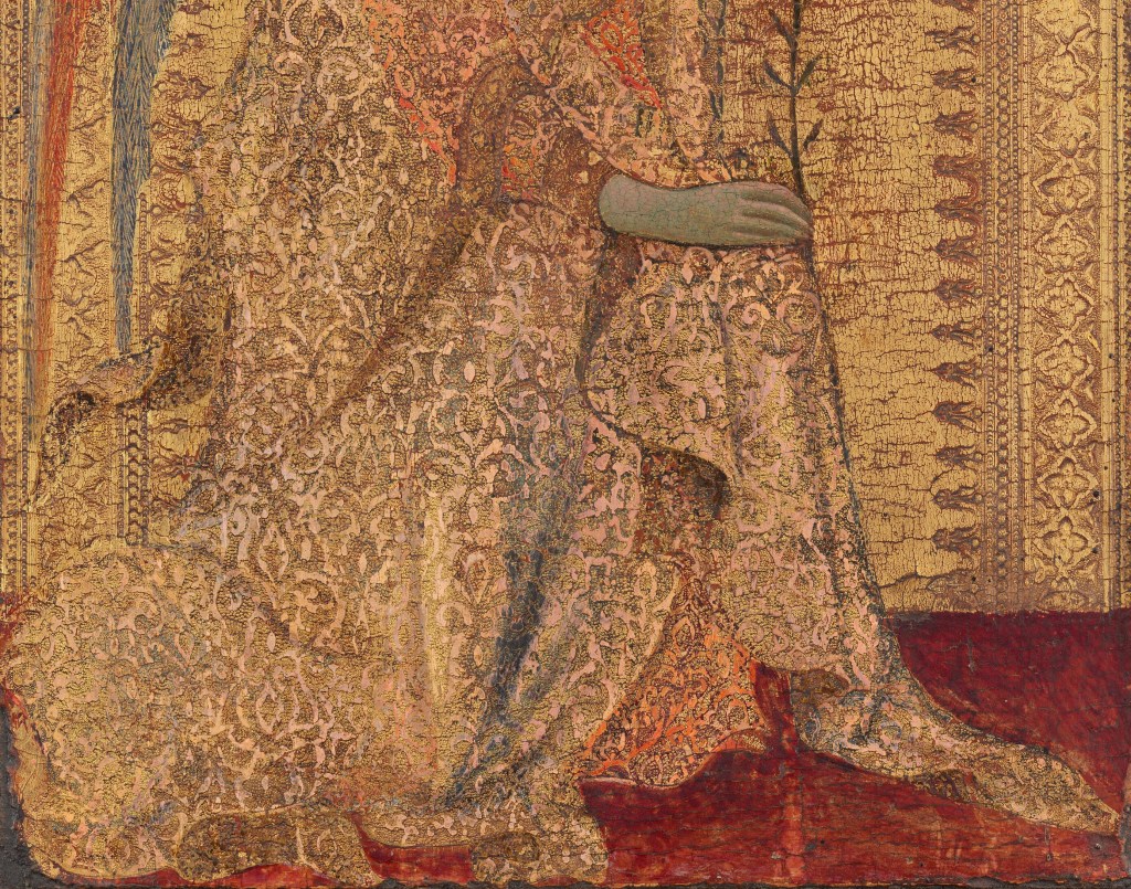 Simone Martini, uno de los pintores sieneses más importantas de su época, logró un acabado suntuoso y de gran delicadeza enfocándose en líneas curvas de gran soltura, la aplicación de colores en capas y en el uso del sgraffito (esgrafiado), una técnica ornamental popular en Italia probablemente inspirada en las cerámicas islámicas.